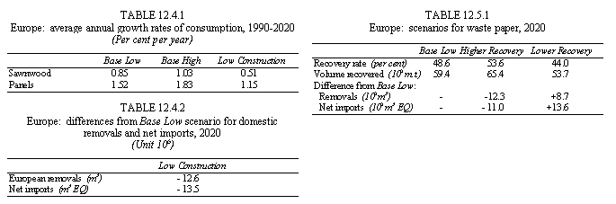 Tables 12.4.1 and 12.4.2 show clearly the importance of the construction market for the European forest sector. If construction activity were to grow slower than projected, so would markets for sawnwood and panels. Both European removals and imports from other regions would be about 13 million m3 lower than in the Base Low scenario.