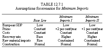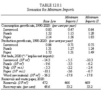 Two alternative scenarios have been constructed to illustrate how the European forest and forest products sector might react to tensions on global forest products markets and higher prices. The assumptions of the two alternative scenarios are compared to those of the Base Low scenario in table 12.8.1. These scenarios (Minimum Imports I and II) are unlike the other alternative scenarios which tried to answer "What if?" questions: the Minimum Imports scenarios attempt to illustrate those conditions which would have to be satisfied if Europe were to reduce its dependence on imports from other regions.