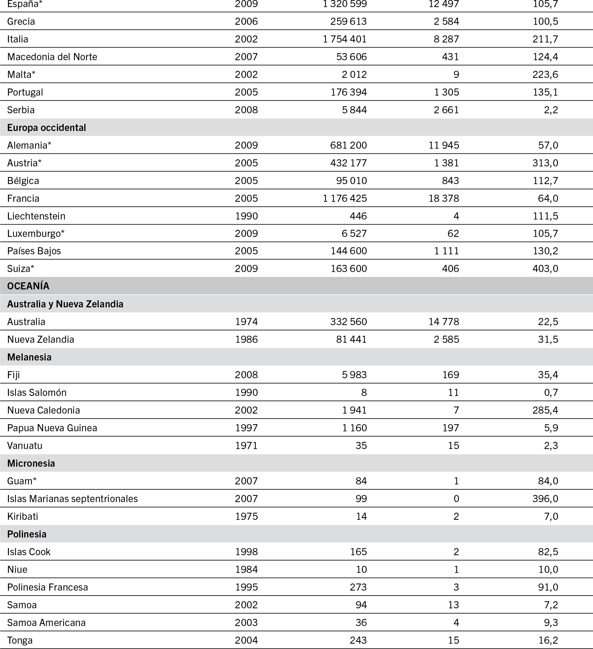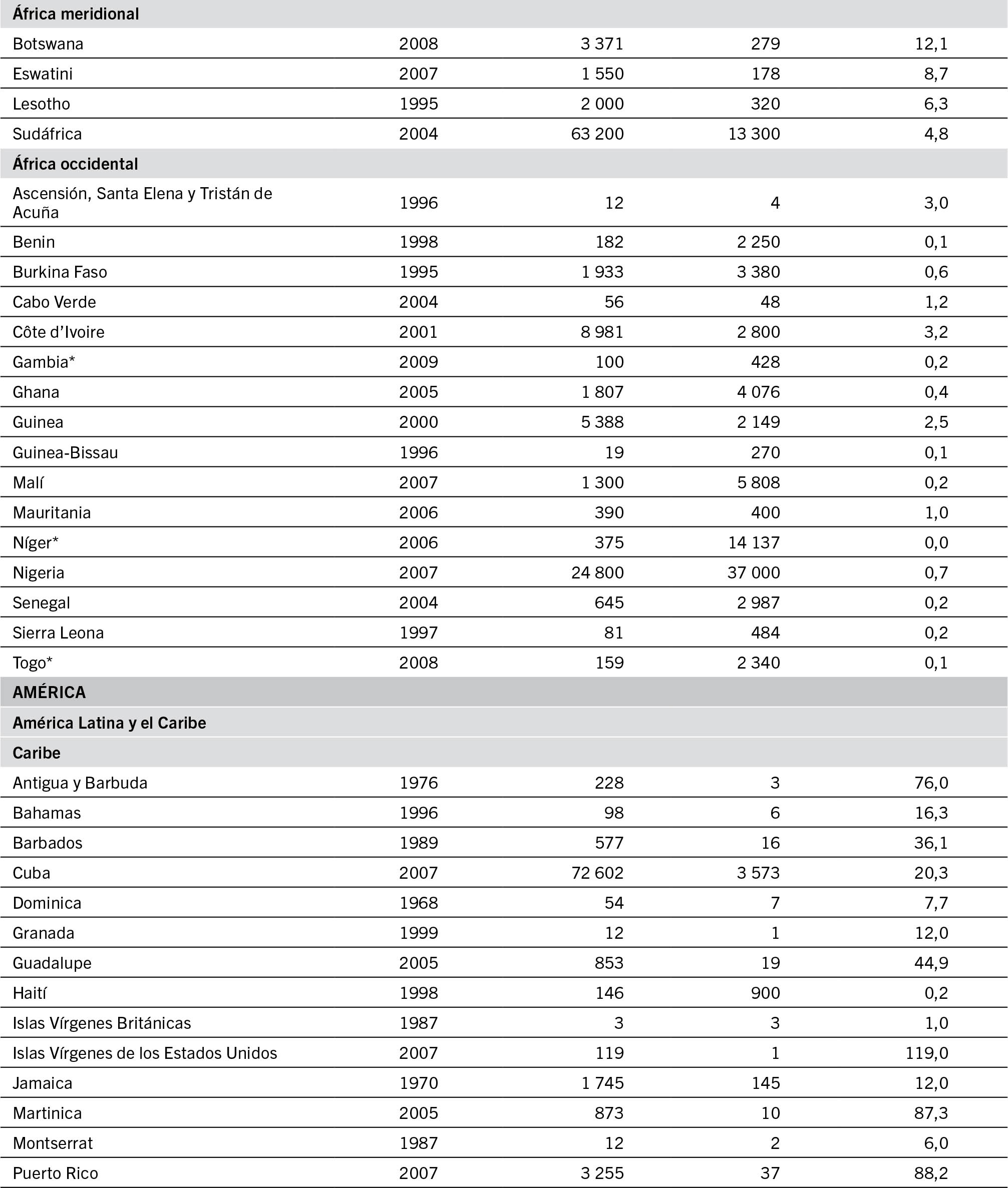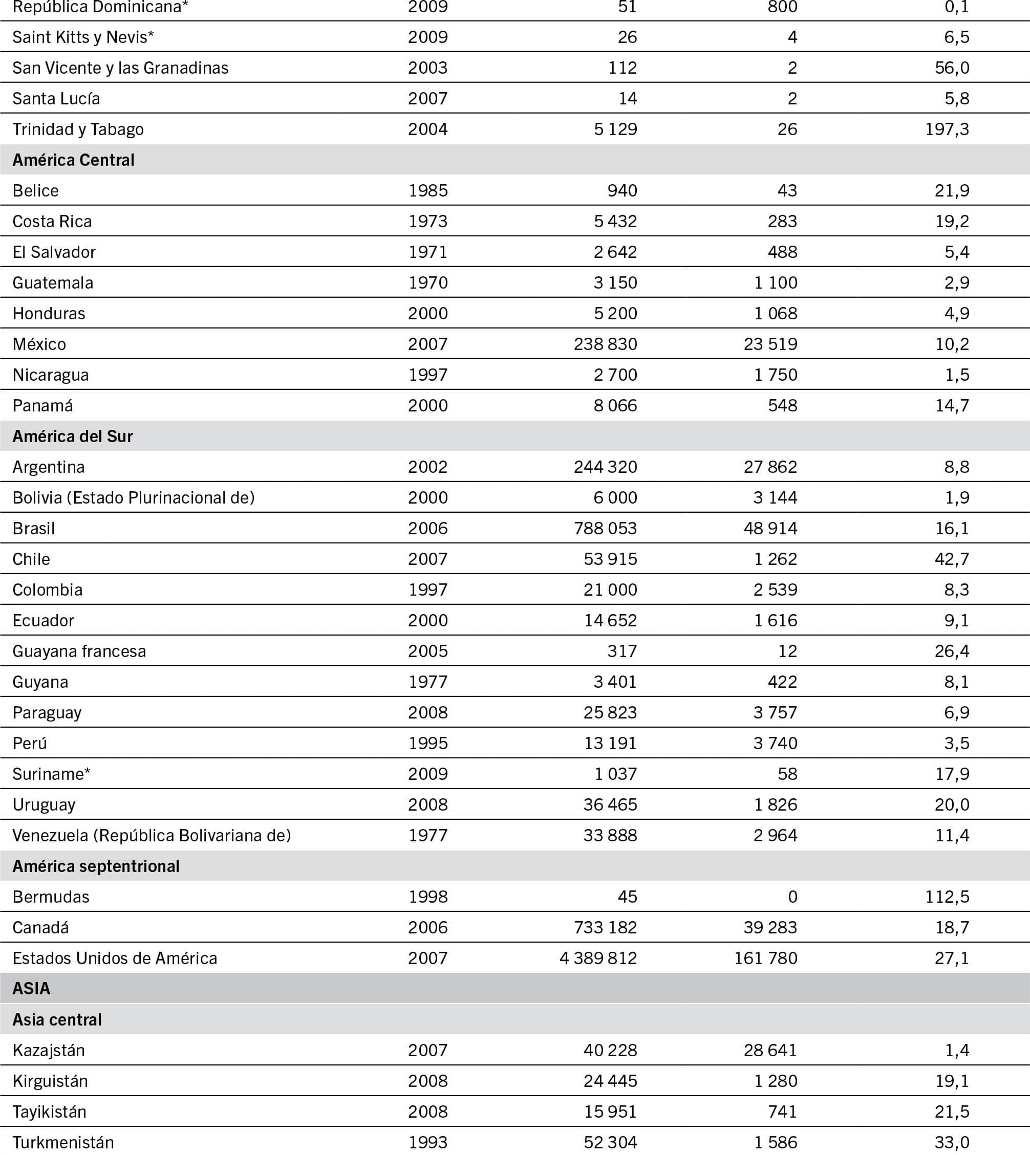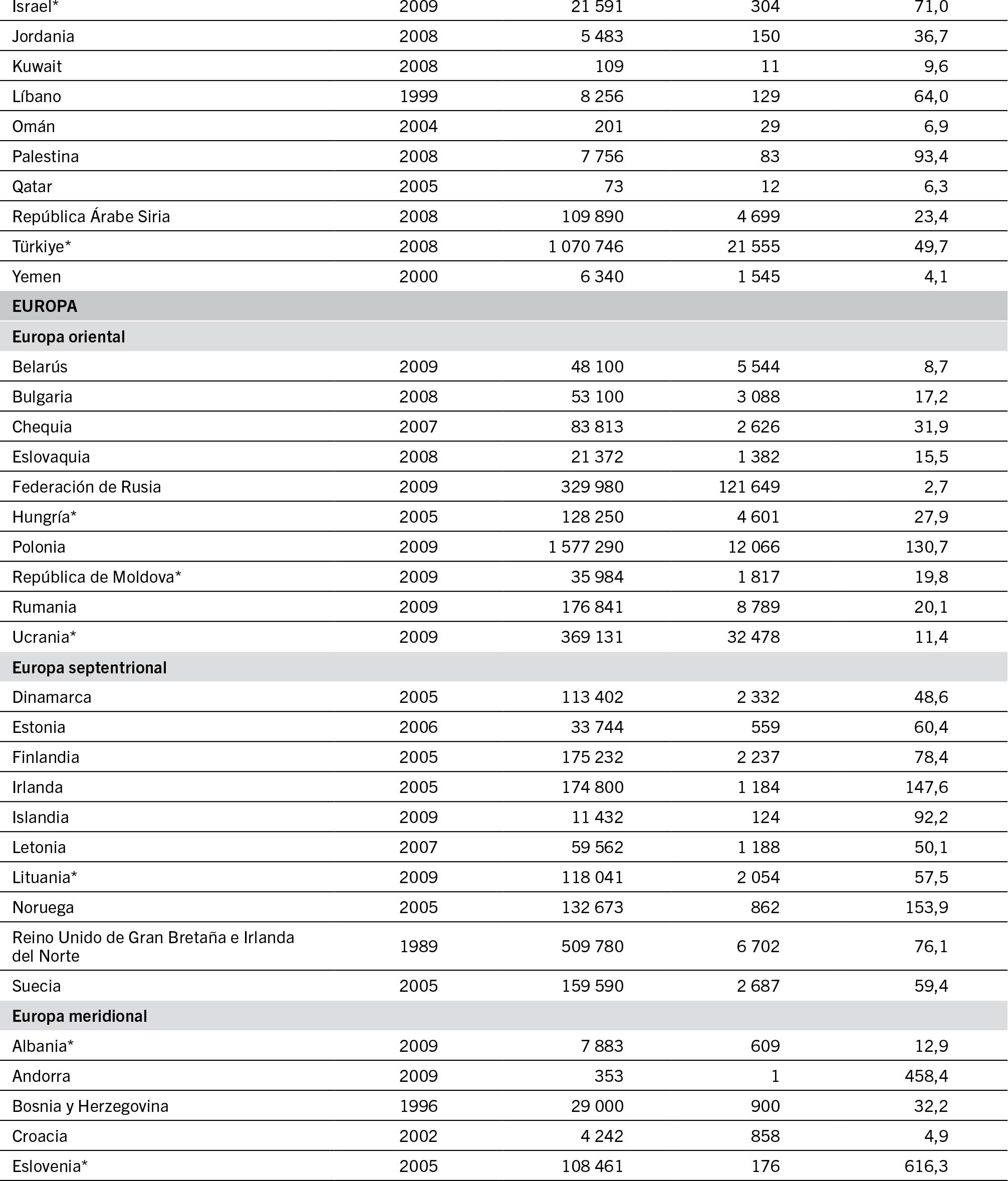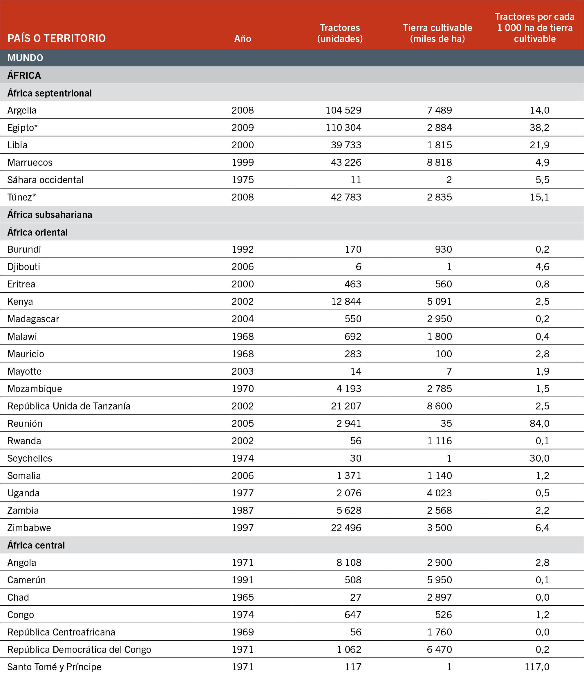 NOTA: Los datos recopilados se refieren a tres tipos de tractores (de ruedas, de oruga y de cadenas); en el caso de los países marcados con asterisco (*), se considera un cuarto tipo de tractor (el motocultor) desde la década de 2000.