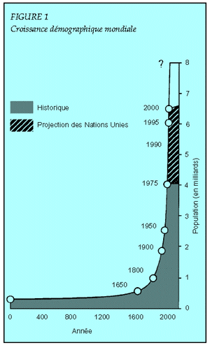 La population mondiale augmente à un rythme alarmant. Si le taux d'accroissement ne ralentit pas dans les quelques décennies à venir, le monde sera confronté à de graves problèmes. La figure 1 illustre le taux d'accroissement de la population au cours des 20 derniers siècles. Il y a 2000 ans, le monde comptait environ 250 millions d'habitants. La population a mis 16 siècles pour doubler alors qu'elle n'a mis que deux siècles et demi pour atteindre le milliard en 1850; puis elle a encore doublé en l'espace d'un siècle, passant à 2 milliards en 1950. Actuellement, la population mondiale double tous les 35 ans et a atteint les 5 milliards avant 1990.