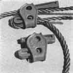 GRAPA ATADORA DE DOBLE CUÑA - Se toma la punta del cable con que se lía el manojo y se le dobla el extremo alrededor de la cuña chica; se atesa tirando de la parte opuesta donde va la cuña grande, que se aprieta a golpe en su posición, con lo cual se consigue un cierre positivo y seguro. Para aflojar la lía, basta correr hacia atrás la cuña grande.