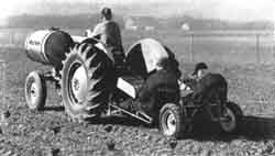 TRANSPLANTADORA MONTADA. N° 550 - Se adapta prácticamente a cualesquiera modelos de tractores; sigue la configuración del terreno y sirve para toda clase de trasplantes y marcos de plantación. Las ruedas compresoras ajustables aprietan bien la tierra al pie de la planta. Una palanca reguladora de profundidad determina la hondura del surco. La rueda izquierda actúa sobro una válvula de agua que se limpia automáticamente y está arreglada para dar salida a un chorro adecuado de trecho en trecho conforme al marco de plantación. Uno o dos estanques de 208 litros se pueden montar en el tractor. Hay posibilidad de variar la distancia entre plantas desde 20 hasta 140 cm.