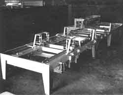 CANTEADORA «KVAL» N° 440 BD. - Cantea y lija automáticamente puertas y tableros por ambos lados y luego hace un doble recortado automático a dimensión en el mismo movimiento continuo de las piezas por la máquina. Sólo el obrero que alimenta ésta y el que recoge el material a la salida son necesarios.