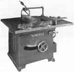 BANCO DE ASERRAR CON EJE BASCULANTE. Características: Tamaño de la mesa principal en una pieza, 109 x 114 cm.; puede extenderse para dados o sufrideras de 10 cm. Capacidad de corte al hilo, 71 cm.; de corte transversal, con escantillones. 76 cm. Eje de sierra, 2,5 cm. de diámetro; hoja mayor posible, 51 cm. de diámetro. Una defensa automática de materia plástica cubro la sierra. Motor del banco, 5 c. f. Se suministra un disco de 41 cm. de diámetro, sea para corte al hilo o transversal. Peso neto, 726 Kg. Hay otros accesorios disponibles.