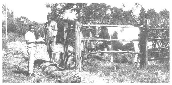 An A.I. technician stops at a road-side crush. Note the herd record file brought with the cow for recording the insemination. Crushes are simple wooden constructions erected along established routes for A.I. operations. This system has been practised extensively in east Africa at a service to smallholdings.
