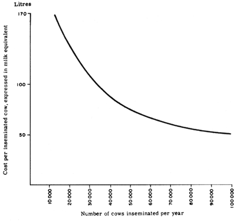 The costs of an A.I. breeding service vary widely among countries, and depend mainly on cattle density and the number of cows served. In the initial stages, with a small number of animals being inseminated, the cost per cow is high. The graph (opposite) shows the approximate relation between the variable costs per inseminated cow and the total number of animals served. The costs are expressed in litres of milk at producer prices, and are derived from planning documents for comprehensive A.I. services in Tanzania and Pakistan, prepared in collaboration with the governments of these countries, and from actual costs in Kenya.