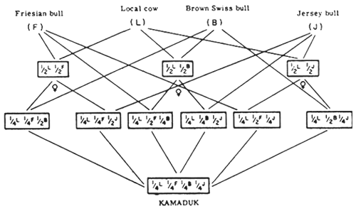 The crossbred bulls may be used to mate with, and eventually to grade up, the local cows. The proportion of exotic blood will thus rise gradually to reach the limiting values of 50 percent, or 75 percent when the displacement is complete and a new breed is formed.