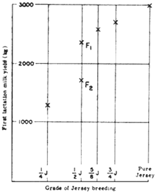 5. Milk yield of Jersey x Red Sindhi crosses in the United States (figure from Branton et al., 1966).