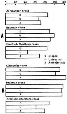 Breed differences in susceptibility to parasites have been studied by comparing responses to parasite control. In herds containing representatives of three breed groups, all run together at pasture and exposed to normal field infestations of the cattle tick (B. microplus) and gastrointestinal mematodes, one third of the animals were dipped twice or three times weekly to control ticks, one third were treated with anthelmintic every two or three weeks to control worms, and one third were left untreated. Gains of each treatment group of each breed in two different experiments (Figure 4) show that HS were profoundly affected by both ticks and worms whereas BX were unaffected by either and AX were somewhat affected by both. Genetic tick resistance, gained by breed selection, crossbreeding, and within-breed selection, is an important contributor to performance in endemic areas and the most efficient means of countering the tick. Genetic differences in susceptibility to gastrointestinal nematodes are obviously of similar importance. A criterion of helminth tolerance, as applicable for selection as are counts of mature ticks in selection for tick resistance, remains to be developed.