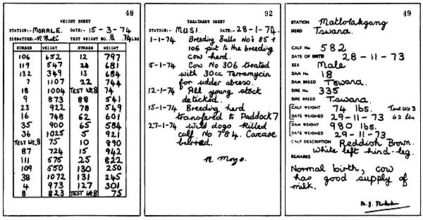 Under the extensive range conditions of Botswana a recording system for individual herds must permit the accurate collection of required information in the simplest possible way. In general, information is required for decision-making at both herd and national level. At herd level it is needed for the evaluation of young bulls with a view to sire replacement and sale of breeding stock; of young heifers with a view to their selection as herd replacements; and of cows in order to decide whether to retain or to cull them. At national level information is needed in order to select outstanding sires for use and further testing for artificial insemination. Data from all sources are needed to allow valid comparisons of breed types, to determine the effects of crossbreeding and to study any differences in performance of the types in different areas of the country.