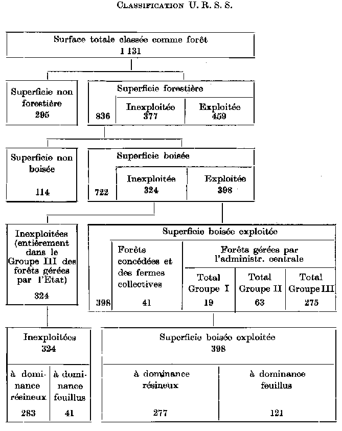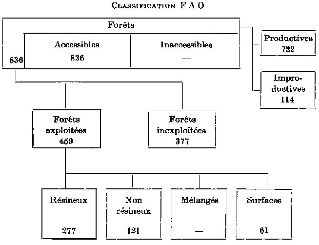 Tout d'abord on observera que la superficie non forestière de l'U.R.S.S. (c'est-à-dire les terres qui, bien qu'étant charge ou sous le contrôle du Service forestier d'Etat, ne sont pas destinées ou sont impropres à la culture forestière; elles se montent à 295 millions d'ha) n'a pas de contrepartie dans lés statistiques FAO et ne figure donc pas dans le diagramme FAO. La superficie forestière est la valeur véritable de l'étendue territoriale des forêts, et c'est ce critère qui est à la base de la classification internationale.