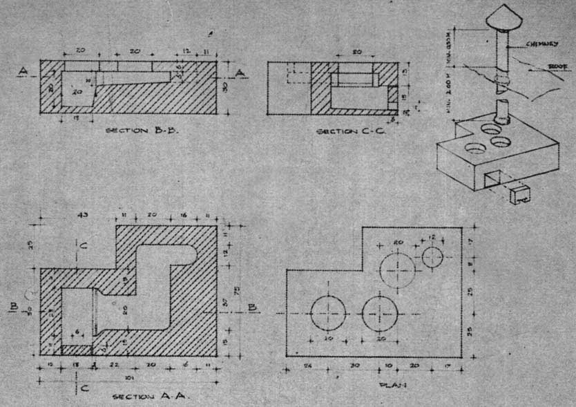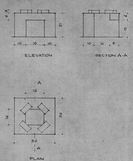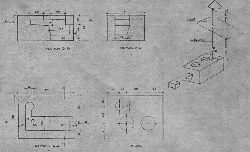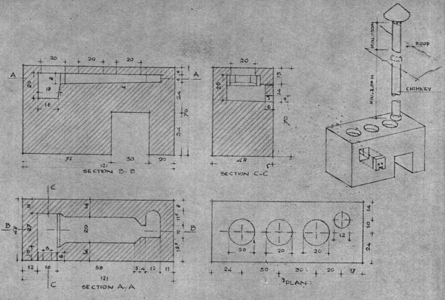 Après examen des modèles existants et des usages culinaires, il apparut désirable de créer un troisième modèle à deux trous, destiné aux petites familles. Il présente les mêmes caractéristiques que les deux autres modèles, c'est-à-dire qu'il possède un foyer fermé, un carneau et une cheminée. Le foyer est disposé parallèlement aux trous de cuisson; mais il peut aussi être perpendiculaire comme dans les deux autres modèles. Pour le fourneau à un trou, composé simplement de trois pierres, il n'est pas possible d'y apporter une transformation fondamentale. Il faut se contenter d'améliorer ce qui existe. La construction est en principe la même, mais on emploie des briques. La face antérieure est fermée au-dessus de l'ouverture d'allumage, ce qui permet d'obtenir une bonne concentration des flammes contre la marmite. Ce modèle est représenté dans la figure 15.