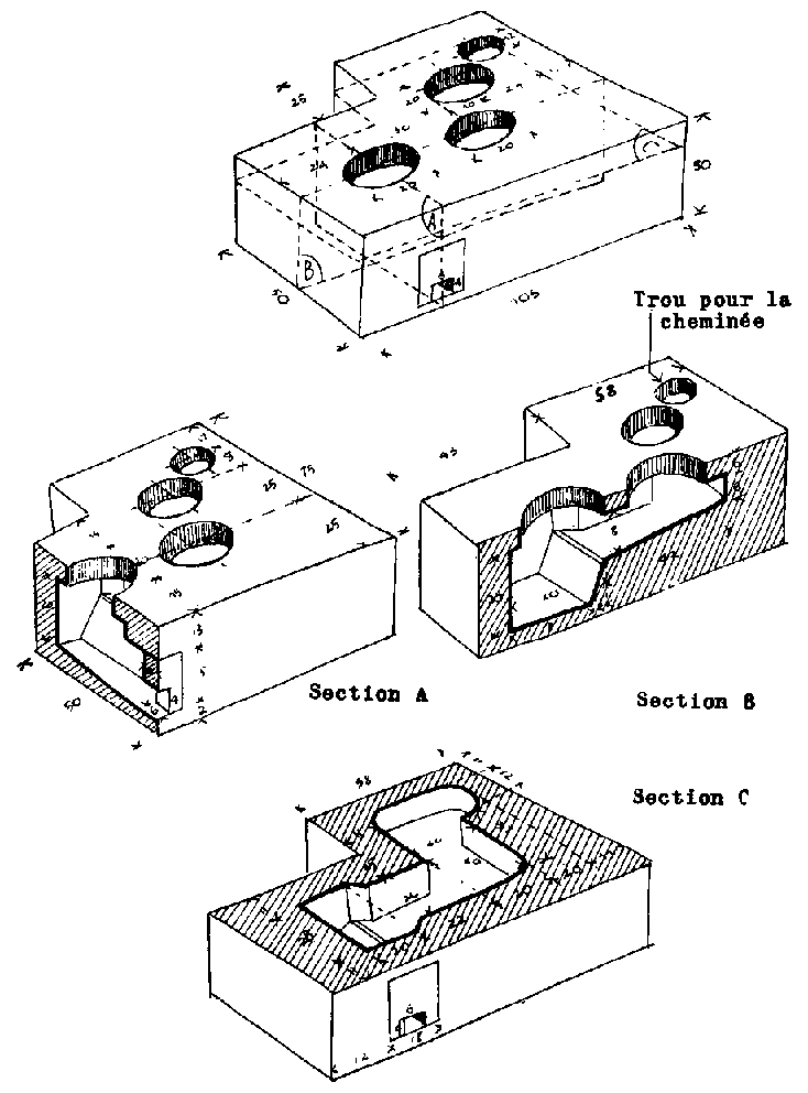 Le foyer remplit les fonctions suivantes: recevoir la quantité de bois nécessaire, procurer à la flamme l'espace nécessaire à son développement, rassembler les braises en un amas compact et assurer une combustion concentrée. Il n'est pas possible de donner des dimensions précises qui soient valables pour tous les cas. Dans les modèles considérés, le foyer a une longueur de 27 à 28 cm, une largeur de 16 à 18 cm à la partie inférieure et 18 à 20 cm à la partie supérieure. La hauteur intérieure devrait être de 20 cm. Il importe surtout que le foyer soit complètement fermé. L'ouverture de charge s'obture au moyen d'une pierre, dont la partie inférieure est pourvue d'un orifice de 6 sur 4 cm pour l'introduction de l'air comburant.