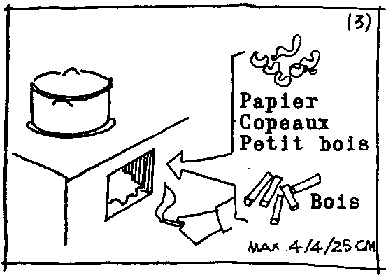 3. On prépare le feu en plaçant d'abord des copeaux ou du papier dans le foyer avec du petit bois et, au-dessus, des bûchettes convenablement fendues.