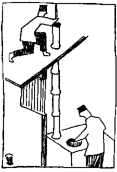 Quelle que soit la méthode appliquée, la cheminée doit être faite de tuyaux d'argile cuits ou de briques cuites. Dans la figure 4, on trouvera figurés la construction et la disposition, ainsi que le passage à travers le toit.