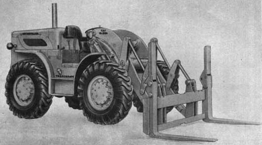 - Charge et décharge en quelques minutes. Opère aussi bien en sol plat que sur terrain inégal. Quatre roues motrices permettent de déplacer la charge vers l'avant à l'emplacement exact souhaité. Peut être manuvré par un seul homme manipulant seulement deux leviers. Entièrement automoteur grâce à un moteur à essence de 9 CV. Capacité de chargement: 10 000 lb. (4 500 kg). Fabriqué en 4 modèles.