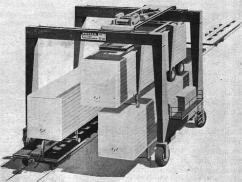 - Transborde un container ou n'importe quelle charge d'un wagon de chemin de fer sur un chassis de véhicule ou à terre, en deux minutes. Peut longer un train, charger ou décharger en se déplaçant. Mû par moteur électrique, dirigé par le conducteur de la grue, conçu pour être chargé facilement. Ensemble démontable en 8 éléments que deux hommes peuvent assembler ou démonter en 4 heures.