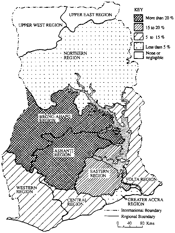 Cassava is grown throughout Ghana, although production is concentrated in the south (see Figure 2). It is cultivated as a monocrop or intercropped, either as the dominant or subsidiary crop (R. Al-Hassan, 1991).