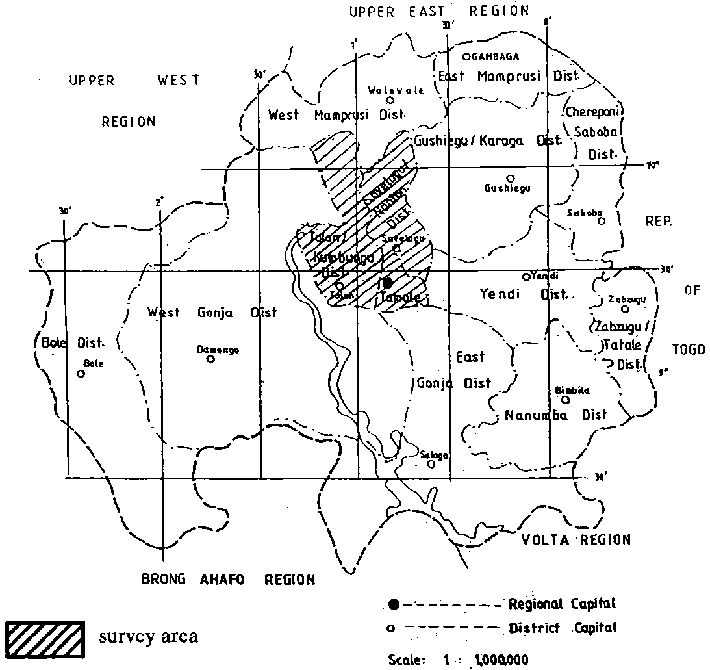 Northern Ghana is situated between 8°-11° N latitude and 0°-3° W longitude. Administratively it comprises the Upper West Region, the Upper East Region and the Northern Region (Runge-Metzger and Diehl, 1993). The Northern Region is the largest region of Ghana, comprising 41% of Ghana's land area, but has the lowest population density of all ten regions in Ghana, which is about 20% of the country's population (PPMED, Ghana, 1991). Tamale is the administrative headquarters of the Northern Region and by far the biggest town in Northern Ghana. Tamale is located in the Western Dagomba District of the Northern Region. The traditional state of Dagbon is the most populous and most ethnically homogenous of the four major traditional states that dominate the Northern Region. The population of the Western Dagomba District is 339998, with a population density of 43 inhabitants per square kilometre (1988). Tamale lies about 175 km east of 1° longitude west and 9° latitude north. This is towards the northern limits of the transition belt between the equatorial zone which has only one peak rainfall. About 80% of the people in the Northern Region depend on farming for their livelihood. Today, maize is the most widely grown cereal crop in northern Ghana. Rainfed agriculture is predominant in the Northern Region, and the potential for irrigation is limited. Increasing population, limited fertile area for crop production and ethnic confrontations describe the current situation in the North (Runge-Metzger and Diehl, 1993).