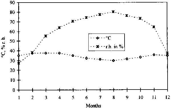 High temperatures are experienced all year round but exhibit wide variations between day and night. Between November and February, maximum day temperatures can reach 33° C to 37° C and minimum night temperatures vary between 20° C and 22° C. The greatest amount of sunshine occurs in the period from November to February for about 8.5 hrs a day, while the lowest is in July and reaches only about four hours a day. The relative humidity of the area varies from 78% to 83% during the months of June to September and then gradually decreases to a low relative humidity of about 15 - 26% in January and in the dry season (Figure 5).