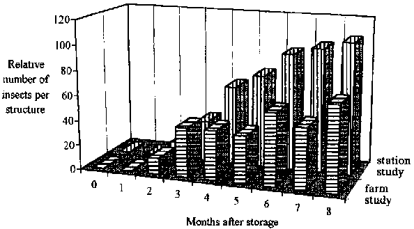 The assessment of weight losses due to insect feeding was carried out in the same way as the study under controlled conditions (see section 3) using the four different loss-assessment methods. Sampling from the selected storage structures was carried out on a four-week basis for about eight months. Insect population dynamics were monitored and insect pests feeding on cassava chips specified. Specimens of interesting species were forwarded to the BBA, Germany for more detailed identification.