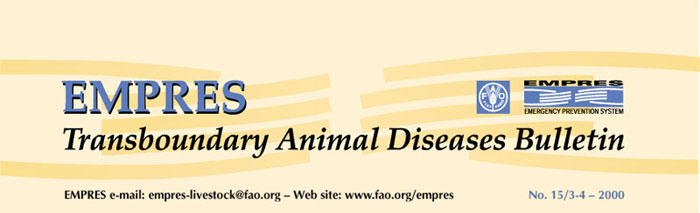 UPDATE ON RIFT VALLEY FEVER OUTBREAKS IN SAUDI ARABIA AND YEMENIn September 2000, Rift Valley fever (RVF) was detected in Saudi Arabia and Yemen, causing human deaths and major losses in the livestock population. It was considered the first documented RVF outbreak outside the African continent, although the virus could possibly have been endemic in the wadi zones for many years in cryptic foci. Editor's note: The numbers 1 to 4 alongside the Issue No. refer to the quarters of the year. Bulletin 15 is in fact a double issue covering the third and fourth quarters of the year 2000, i.e. July to December. |