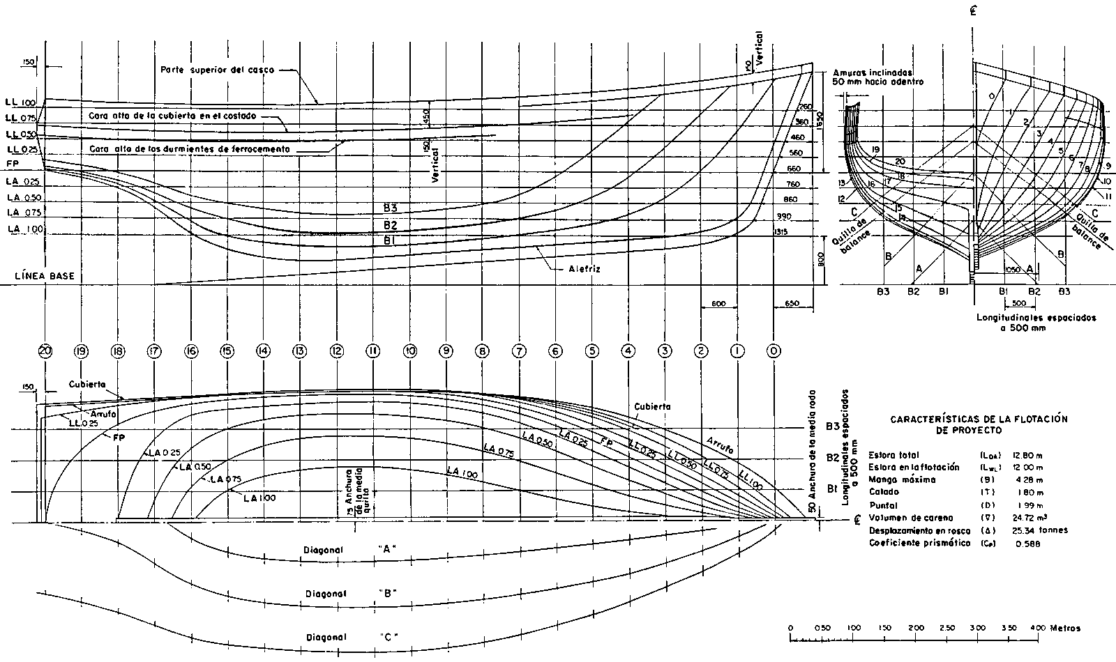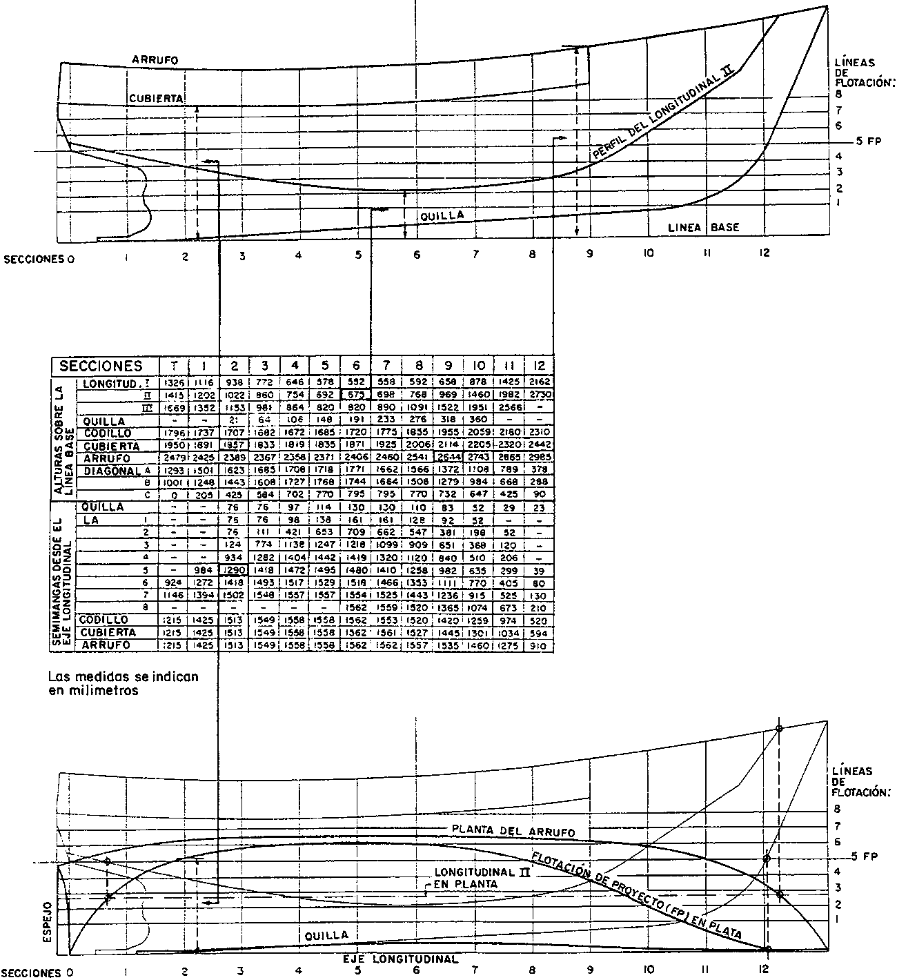 Una vez trazadas todas las formas de los perfiles y semimangas, se anotan las mediciones revisadas en una nueva cartilla de trazado No. 2. Ahora puede ya procederse a trazar el plano del cuerpo. Se colocan los tableros correspondientes y se traza un cuadriculado en el plano de formas del proyectista con todas las líneas de flotación, longitudinales, diagonales y eje longitudinal de la embarcación marcadas de la manera indicada.