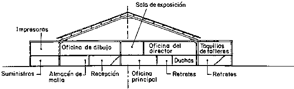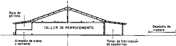 Si bien es natural prestar gran atención a las exigencias de la construcción en ferrocemento, es esencial, al mismo tiempo, disponer de un edificio del tipo adecuado que tenga en cuenta las condiciones climáticas locales prevalecientes. Aunque en los climas cálidos pueden utilizarse varios tipos de estructuras ligeras o temporales, constituyen generalmente una solución a corto plazo, y si se quiere construir un buque que responda a las normas de clasificación, los requisitos para el control del almacenamiento del material, condiciones del taller y disposición general de las distintas etapas de construcción, son bastante exigentes. Conviene, por lo tanto, estudiar debidamente la estructura y disposición del edificio (véanse las figuras 4 y 5).