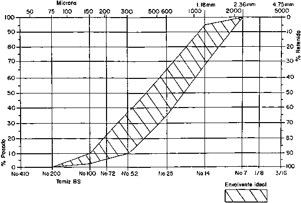Este análisis se llevará a cabo todas las veces que sea necesario para mantener la correcta granulación de la arena que va a utilizarse. La granulación de un agregado de arena para el ferrocemento se encuentra pasando una muestra representativa de la arena seca a través de una serie de tamices de la norma BS Nos. 7, 14, 25, 52, 100 (o normas locales equivalentes), empezando por el tamiz más grueso. Conviene anotar los resultados obtenidos (véase la figura 8) comparándolos con la envolvente aceptable (véase la figura 6). Esta envolvente variará ligeramente de la que se muestra en la figura según las normas de trabajo, pero el autor de estas líneas la ha utilizado durante muchos años.