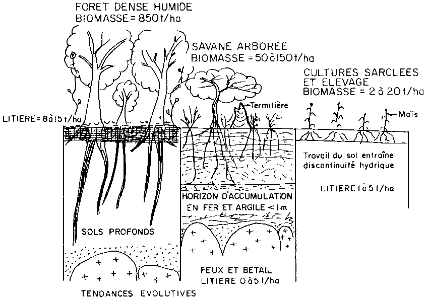 - L'érosion accélérée par l'homme, suite à une exploitation imprudente du milieu, est 10 à 1.000 fois plus rapide que l'érosion normale. Il suffit d'une perte en terre de 12 à 15 t/ha/an, soit 1 mm/an ou 1m/1.000 ans pour dépasser la vitesse de l'altération des roches (20 à100.000 ans pour altérer 1 m de granit en conditions tropicales humides, selon Leneuf, 1965). La couche arable s'appauvrit en particules par érosion sélective (squelettisation du sol) et s'amincit (décapage), tandis que le ruissellement s'accélère (20 à 50 fois plus de ruissellement sous culture que sous forêt) provoquant à l'aval des débits de pointe très dommageables pour le réseau hydrographique (Roose, 1973).