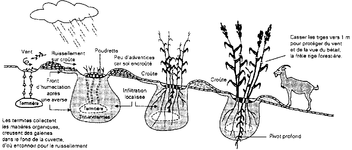 Un excellent exemple de restauration rapide de la productivité des terres dégradées (Zipellé en Moore) est donné par la méthode traditionnelle mossi qu'on appelle le Zaï et ses variantes comme le zaï forestier (figure 5). En saison sèche, le paysan creuse dans les parcelles dégradées (zipellé) des cuvettes (40 cm de diamètre, 15 cm de profondeur) tous les 80 cm en rejetant la terre vers l'aval. Le vent sec du désert (Harmattan) y pousse divers résidus organiques qui seront bientôt attaqués par les termites. Ces termites (Trinervitermes) creusent des galeries qui percent la surface encroûtée du sol et permettent aux premières pluies de s'infiltrer en profondeur hors d'atteinte de l'évaporation directe.