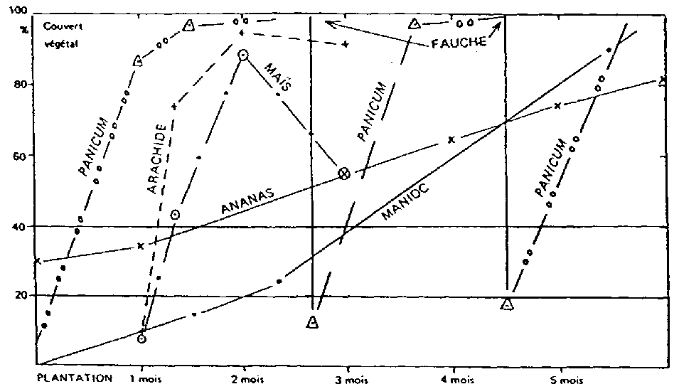 Certaines plantes comme l'arachide, le maïs et d'autres céréales, couvrent très mal le sol les deux premiers mois. Ce n'est qu'à la fin du troisième mois qu'elles dépassent 80 % de couverture du sol mais leur cycle étant assez court (de 4 mois), tout le reste de l'année, les sols nus sont soumis à la battance, à moins que les adventices ne couvrent le sol et n'absorbent l'énergie des gouttes de pluie. D'autres plantes sont considérées comme dégradantes alors que c'est simplement leur mode de culture qui est mal adapté ou qui couvre mal le sol. C'est le cas par exemple, du tabac que l'on plante à grand écartement de façon à avoir de très belles feuilles. On peut résoudre ce problème en paillant les surfaces des cultures peu couvrantes. Il n'est évidemment pas possible d'utiliser du paillage sous cotonniers, autre plante dégradante renommée. Le cotonnier met au moins deux mois à couvrir le sol. Par ailleurs, il ne laisse aucune trace de matière organique dans le sol après son passage puisque les feuilles sont broûtées, les tiges soigneusement arrachées et brûlées, y compris les racines. C'est donc à la fois le manque de couverture végétale et le déséquilibre du bilan organique qui entraîne la dégradation des sols sous ces différentes cultures. Par contre, le Panicum maximum et d'autres graminées en grosses touffes, arrivent à couvrir le sol au bout d'un mois.