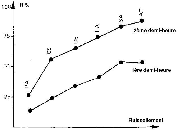 - que le coefficient de variation est élevé au cours de la première demi-heure (13 à 54 %), mais qu'il diminue à mesure que la pluie se prolonge: l'état de surface est donc très variable et important à la surface de la vigne durant les brefs orages, mais les différences se confirment au cours de la deuxième demi-heure.