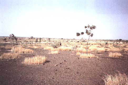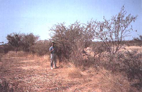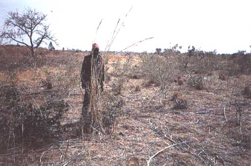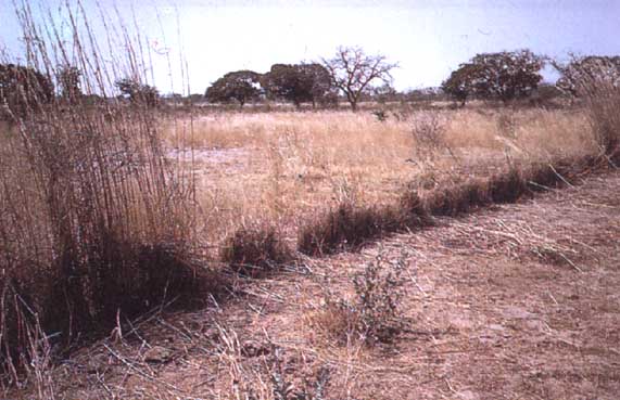 - sur la parcelle soumise aux feux courants précoces, un mois après la dernière pluie utile, de hautes herbes partagent la surface avec une végétation arbustive, pyrophile, rabougrie, difforme, mais assez abondante;