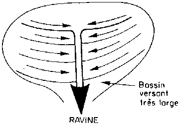 lors des pluies fortes, le ruissellement risque de déborder, de créer une brèche par où vont s'écouler toutes les eaux retenues derrière les billons, brèche qui va se transformer en ravine, plus difficile à effacer que les multiples petites rigoles qui drainent les billons orientés dans le sens de la pente (bassin drainant plus petit). | |||