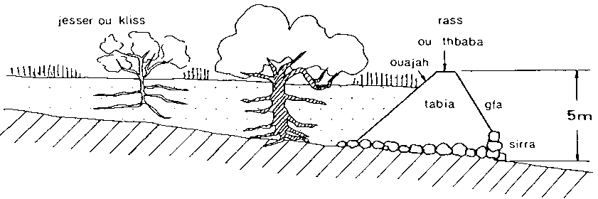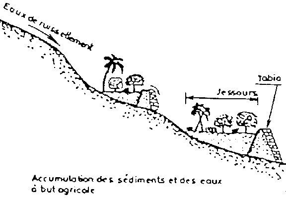 Il distingue en amont des bassins, les "tabias", bourrelets de terre de forme trapézoïdale, armés à l'aval d'un mur de pierres et sur les côtés, d'un exutoire empierré, haut de 2 à 5 m qui barre une vallée de quelques dizaines de mètres de large. Derrière la tabia qui sert de chemin (rass), s'accumulent les eaux de ruissellement et des sédiments limono-sableux délimitant le jessour, sorte de champ bien alimenté en eau, où croissent des cultures annuelles (orge, pois, lentilles, fèves, pastèques) à l'ombre d'arbres bien adaptés aux apports sédimentaires successifs (figuiers, oliviers, grenadiers, amandiers) (figures 33 et 34).