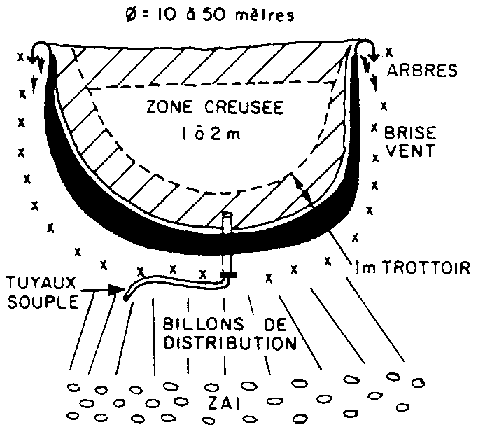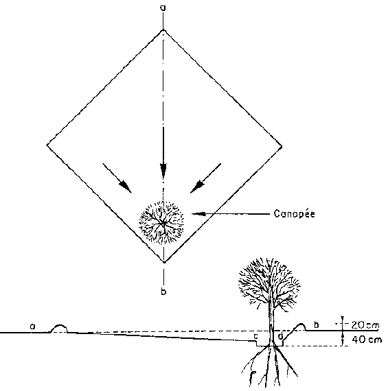 Le système probablement le plus connu d'impluvium permettant de récolter de l'eau sur des courtes pentes pour irriguer une culture d'arbres, est certainement les micro-bassins (figure 40). L'élément de base est une petite excavation formant un bassin d'infiltration et une bordure formée d'une diguette en terre de 20 cm de haut tandis que le bassin aurait 40 cm de profondeur. Les diguettes peuvent avoir une forme en V ou en demi-lune. En Israël, dans un nouveau verger, la zone d'infiltration serait de l'ordre de 4 x 4 m, tandis que l'impluvium aurait 3 à6 fois plus de surface.