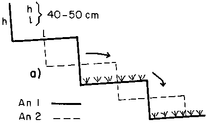 La méthode traditionnelle des micro-terrasses en escaliers (figure 44), directement dérivée de la méthode des gradins, consiste à creuser des marches de 50 cm de large que l'on va déplacer chaque année de 25 cm pour entretenir une surface rugueuse et enfouir la végétation qui pousse pendant la jachère. Cette méthode traditionnelle casse l'énergie du ruissellement sur les pentes pouvant atteindre 80 % mais elle n'arrête pas le glissement lent de la couverture pédologique vers le bas de la pente par l'érosion mécanique sèche (Rwehumbiza et Roose, 1991; Hudson, 1973; Fournier, 1967).