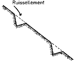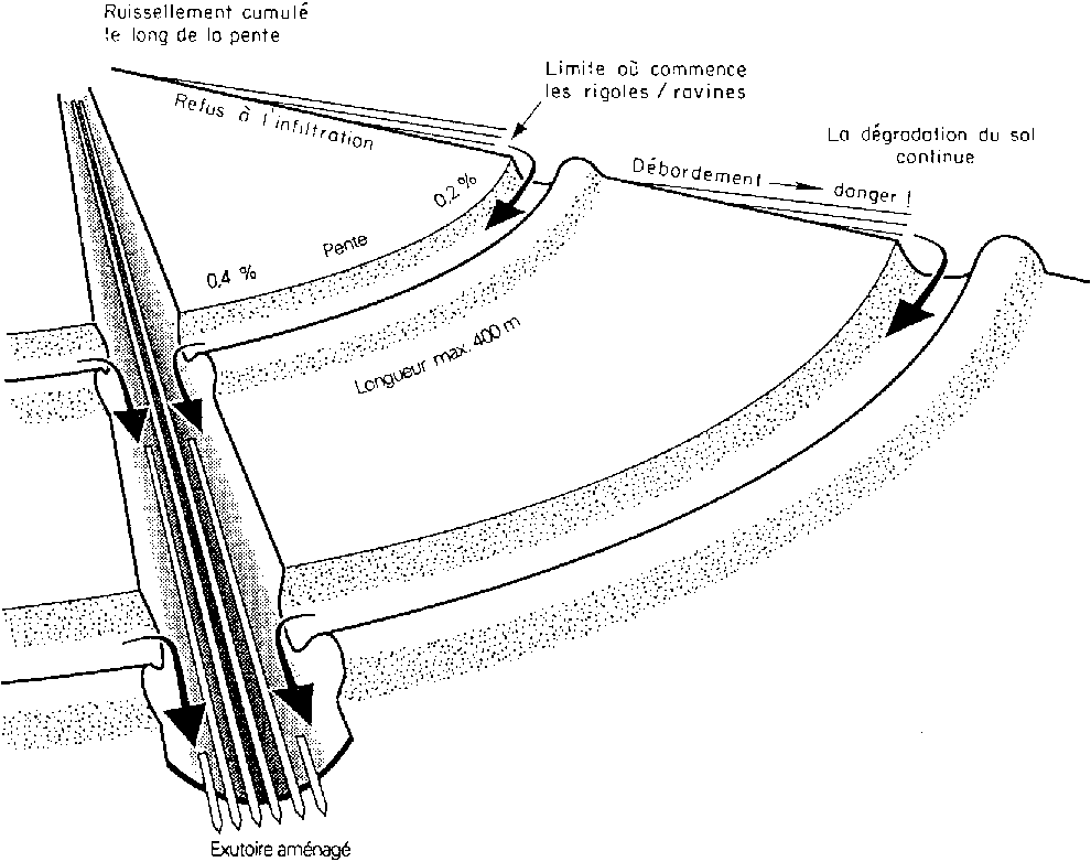 Lorsque les eaux de pluie sont trop abondantes ou trop intenses pour être stockées ou infiltrées totalement dans le sol, on organise leur drainage dans des fossés, le long de diguettes, banquettes ou des terrasses de diversion (figure 45) pour récupérer les nappes ruisselantes avant qu'elles aient acquis une énergie suffisante pour raviner le versant. Ces eaux de ruissellement sont alors évacuées en dehors de la zone de culture vers des exutoires naturels ou des exutoires qu'il faut aménager, en leur permettant d'atteindre le niveau de base de la rivière sans créer de dégâts trop importants.