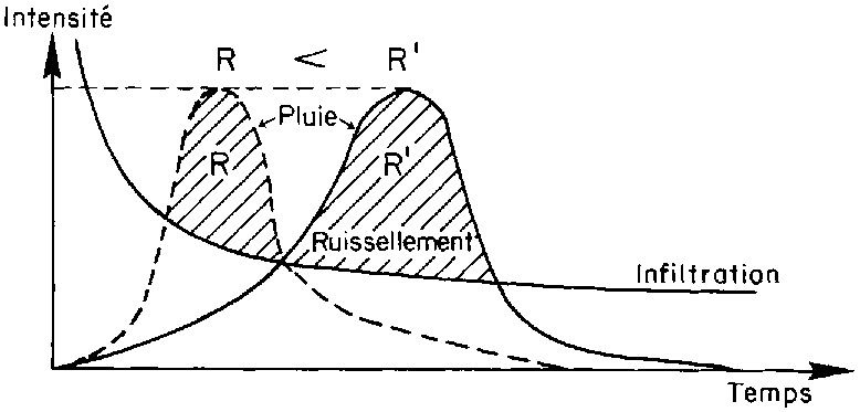 1° Théorie de Horton (1945) Le ruissellement naît lorsque l'intensité des pluies est supérieure à la capacité d'infiltration du sol (figure 54a). Si on compare l'infiltration à l'intensité de la pluie, on constate que l'intensité d'infiltration décroît au cours du temps, d'une part parce que le potentiel capillaire diminue à mesure que le front d'infiltration pénètre à l'intérieur du sol et d'autre part, par dégradation de l'état de la structure à la surface du sol. Par contre, l'intensité de la pluie passe généralement par un (ou plusieurs) maximum et le volume de la pluie situé au-dessus de la courbe d'infiltration peut être considéré comme le ruissellement. On constate dans l'exemple choisi, pour une séquence d'intensité voisine que le volume du ruissellement peut varier considérablement en fonction de la période où apparaît le maximum d'intensité dans l'averse. Plus tôt apparaît ce maximum, plus réduit sera le ruissellement puisque la capacité d'infiltration diminue au cours du temps. Cependant, les hydrologues ont montré qu'il était rare d'obtenir une bonne corrélation entre le volume ruisselé sur un bassin versant et l'intensité des pluies. On a donc cherché une autre explication.