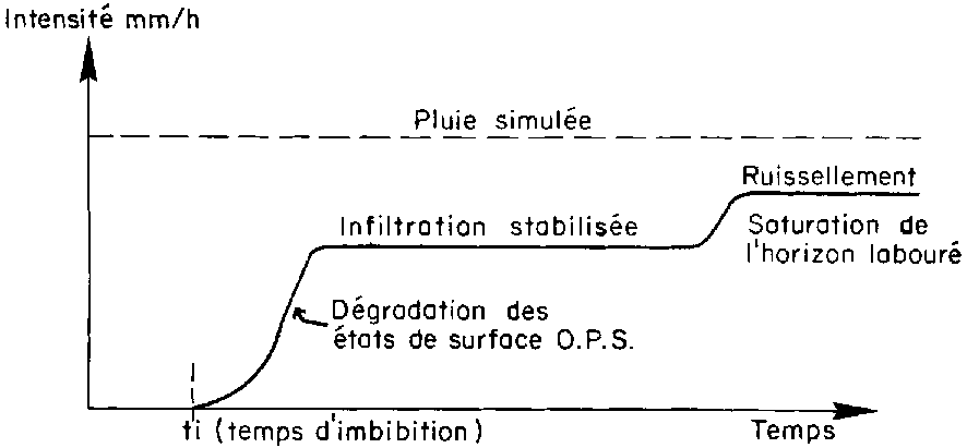 2° Théorie de la saturation du milieu. Le ruissellement naît lorsque l'espace poreux du sol est saturé (figure 54b). Si au cours d'une pluie simulée on constate d'abord le démarrage du ruissellement après une pluie d'imbibition, le ruissellement va augmenter jusqu'à atteindre un niveau stabilisé correspondant à la capacité d'infiltration stabilisée du sol. Mais si la pluie persévère (plus de 100 mm), il peut arriver que l'on observe une nouvelle croissance du ruissellement et un nouveau plateau d'infiltration stabilisée. Il s'agit simplement de la saturation de l'horizon labouré; elle provoque le débordement de cette capacité de stockage que représente la macroporosité de l'horizon labouré. On peut constater soit que l'intensité de ruissellement correspond exactement à celle de la pluie simulée si l'horizon de profondeur est totalement imperméable ou qu'il reste une certaine capacité d'infiltration résiduelle correspondant à celle du fond de labour. Lorsqu'un milieu est totalement saturé, toute goutte d'eau tombant dans ce milieu ruisselle, quelle que soit l'intensité de la pluie.