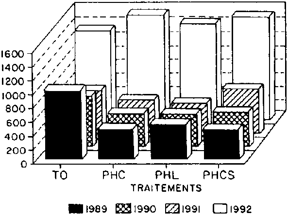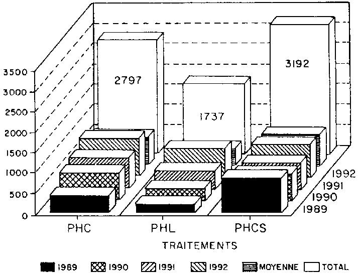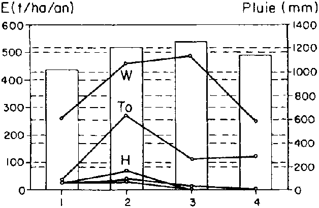Les pertes en terre: L'érosion en nappe et rigole décroît de 450 t/ha/an sur jachère nue à 80-120 t/ha/an sur cultures traditionnelles et 1 à 2 t/ha/an sous cultures, deux à trois ans après plantation de haies vives. Il faut noter que les cultures ont reçu 10 t/ha/an de fumier de ferme (et même 90 t/ha la troisième année). Même un tel apport de fumier n'a pas suffi à réduire l'érosion à un niveau tolérable: mais si l'érosion a tendance à augmenter d'année en année sous culture traditionnelle, elle diminue sur les parcelles protégées par des haies vives, à mesure que la pente du terrain cultivé diminue (de 27 à 15 %).