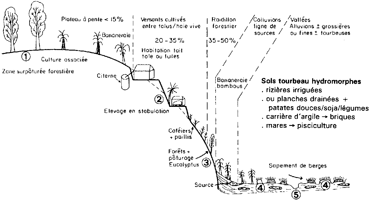 ® apport d'un complément minéral localisé fractionné aux plantes 4 Transformer les talus en zones fourragères stabilisées par les haies vives de légumineuses + herbes et rejets de labour (racines, brindilles, pierres) 5 Aménagement des pistes: enherbement généralisé et drainage organisé vers des citernes ou des fosses de sédimentation plantées en bananiers 6 Nécessité d'organiser le marché des produits agricoles (pistes, etc) et des intrants |