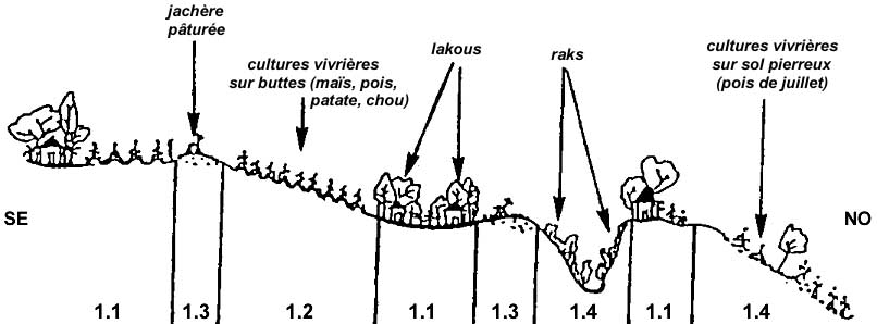 - La protection des zones à bonnes potentialités agricoles (jardins A et B. sols à bon potentiel) contre les eaux de ruissellement. Ainsi la construction de trois kilomètres de piste bétonnée (60 FF/m) en aval des terres à fort ruissellement (rendzines) et en amont des sols ferralitiques a été réalisée et a permis la récupération de ces eaux. Cette piste rurale sert d'impluvium. Elle est protégée par des murettes et renforcée par des canaux exutoires vers les ravines torrentielles.