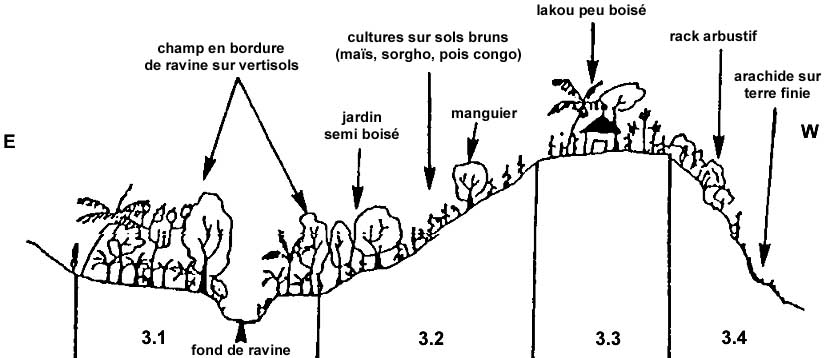 - Couvrir les pentes de 40 à 60% en réimplantant un parc aéré afin de ralentir la migration de la couverture pédologique par la plantation d'arbres sur les terres très dégradées et de façon éparse sur les parcelles. Dans les unités 1, 2 (calcaire-marneux) et 3, des espèces fruitières (150/ha) sont installées dans des cuvettes de 0,5 m
