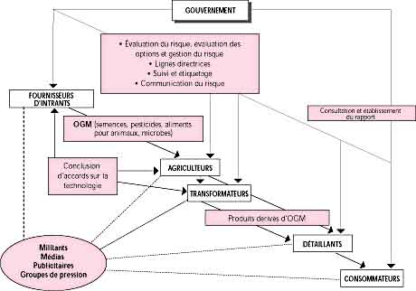 Le système de production et de distribution agricole peut être considéré comme une chaîne d'approvisionnement (voir figure): i) les transformateurs et les détaillants acheminent les produits des producteurs aux consommateurs; ii) les publicitaires, les militants, les membres de groupes de pression et les médias cherchent à influencer les décisions qui sont prises à chacune des étapes de la chaîne d'approvisionnement; iii) les organismes publics de réglementation évaluent les risques, établissent des règles et en vérifient l'application; iv) les producteurs de denrées alimentaires, de poisson, de fibres et de produits forestiers achètent des intrants tels que des graines, du matériel végétal, des produits agrochimiques, des engrais, des aliments pour animaux, des agents de fermentation et de l'équipement; et v) les OGM parviennent au public par l'entremise des marchés. Les consommateurs - c'est-à-dire, en réalité, tous les habitants de la planète, y compris les générations futures - sont également directement concernés.