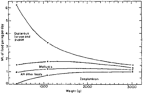 Similarly, Bruton (1979b) found that catfish in Lake Sibaya (South Africa) fed mainly on fish or crustacea, and that terrestrial and aquatic insects were an important part of the diet of juvenile and adult fish which inhabit shallow areas. However, molluscs, diatoms, arachnids, and plant debris were the minor food items consumed in this lake. Munro (1967) studied the feeding habits of C. gariepinus in Lake McIIwaine (Zimbabwe) and found that feed composition changed as fish became larger; Diptera, particularly chironomid pupae, predominating in the diet of the smaller fish and becoming progressively less important with increasing size. Zooplankton became more important with increasing fish size and predominated in the diet of the largest fish. Most of the minor food groups also showed a progressive increase or decrease in importance in relation to increasing size (Figure 5). The greater importance of zooplankton in the diet of large fish was believed to be due to the increased gape and number of gill rakers of the larger fish (Jubb, 1961; Groenewald, 1964); presumably resulting in more efficient filter feeding.