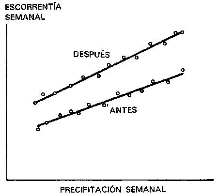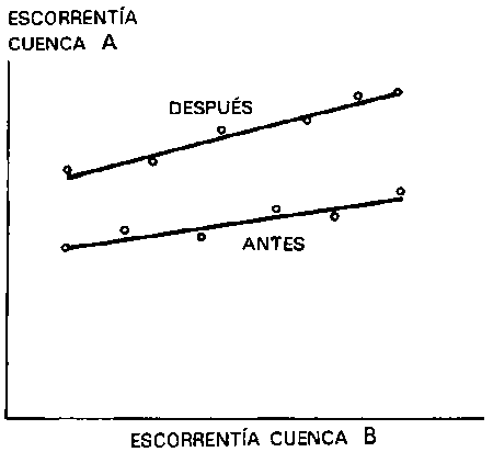 Un método que a veces se emplea para evaluar el efecto de algún cambio consiste en efectuar una serie de mediciones antes del mismo y compararlas con una serie similar realizada después. Esto es sencillo pero fundamentalmente incorrecto debido a que no hay forma de identificar si la diferencia ha sido causada directamente por el tratamiento o procede de alguna otra causa o cambio entre los dos conjuntos de mediciones. La Figura 1 muestra un ejemplo de ello. Se realiza un experimento para calcular el efecto del cambio de la intensidad del pastoreo en la escorrentía en una pequeña cuenca hidrográfica; las mediciones de la escorrentía semanal total se trazan en comparación con las precipitaciones semanales, y al final de la temporada entre 20 y 30 puntos parecen indicar una correlación estrecha. En la temporada siguiente se aplica el tratamiento, consistente en duplicar el número de animales en pastoreo, y al analizar los resultados al final de la misma se encuentra que la relación es considerablemente diferente. El problema radica en que no es posible asegurar que la diferencia haya sido causada por el tratamiento y no refleje el hecho de que las precipitaciones durante la segunda temporada fueron diferentes. Si las precipitaciones son mucho más intensas, esto podría por sí solo explicar el caudal superior de la escorrentía. No existen medios de análisis estadístico que permitan superar esta dificultad y en las observaciones se ha permitido que una variable incontrolable e inmensurable se introdujera y creara confusión; no hay manera de suprimir este efecto.