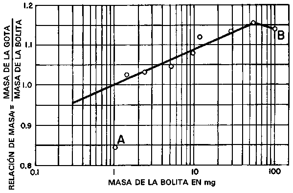 La segunda anomalía en los resultados experimentales fue la situación opuesta: se suprimieron unos resultados aparentemente falsos por contener un error experimental aunque más tarde la investigación mostró que eran verdaderos. La medición del tamaño de las gotas de lluvia se solía realizar recogiendo las gotas en bandejas con harina y pesando la bolita formada en la harina por cada gota. Una calibración efectuada anteriormente en laboratorio daba la relación entre el peso de la bolita y el peso de la gota de agua, y esta relación se expresaba como una relación de masa. Cuando Laws y Parsons utilizaron este método en 1943, los resultados obtenidos fueron los indicados en la Figura 4 y asumieron que una bolita de harina no podía pesar menos que la gota que la constituía, por lo que ignoraron el punto A; sin embargo, ahora se sabe que, de hecho, esto puede suceder y sucede. Los otros puntos se acercaban a una línea recta, salvo la gota mayor, por lo que ignoraron asimismo el punto B. Se sabe actualmente que ese resultado también era auténtico y que una curva suave a lo largo de todos los resultados es mejor que la relación de línea recta que suponían.