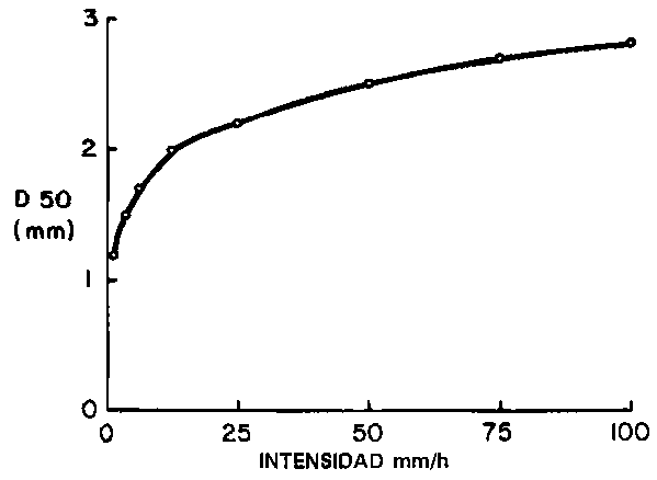 No obstante, esta ecuación hace pensar que la dimensión mediana de la gota seguirá aumentando a medida que aumente la intensidad y, aunque esto es cierto dentro de los límites de los valores de las mediciones de Laws y Parsons, las investigaciones posteriores, a intensidades superiores, han mostrado que esto no es válido para las intensidades elevadas que se producen en las tormentas de lluvias tropicales. En realidad, existe una explicación física de este fenómeno. Hay un límite al tamaño de las gotas de lluvia que caen debido a que por encima de ese límite pasan a ser inestables y se rompen en gotas más pequeñas; de hecho, ahora se sabe que el diámetro medio de una gota alcanza un máximo y luego disminuye como se indica en la Figura 6. Cuando fue necesario calcular la energía de la lluvia para calcular el factor de erosividad de la Ecuación Universal de la Pérdida de Suelo, la relación de Laws y Parsons entre el tamaño de la gota y la intensidad se extrapoló hasta intensidades de 250 mm, con el resultado de que la energía cinética de las precipitaciones tropicales resultó considerablemente exagerada. Recién en 1987 se revisó el Manual de Agricultura del Departamento de Agricultura de los Estados Unidos para elevar los límites de la energía de las precipitaciones; lamentablemente, hasta entonces muchos estudios sobre las precipitaciones tropicales resultaron confusos o incorrectos a consecuencia de este error básico.
